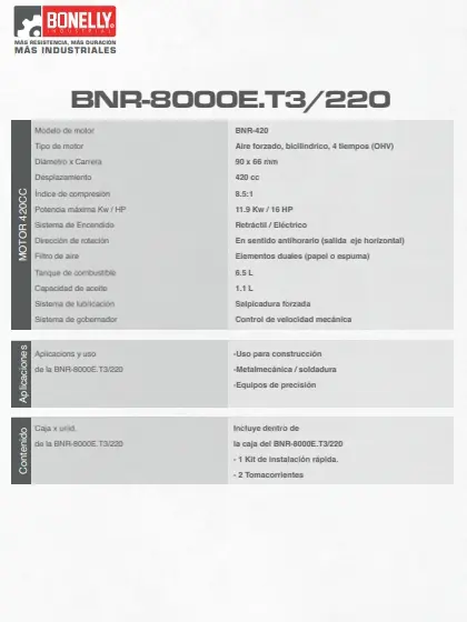 Diseñado para enfrentar tareas exigentes, el generador Bonelly BNR-8000E.T3/220 ofrece potencia trifásica de 7KW en 220V. Es ideal para operaciones industriales, maquinaria o respaldo energético confiable.
